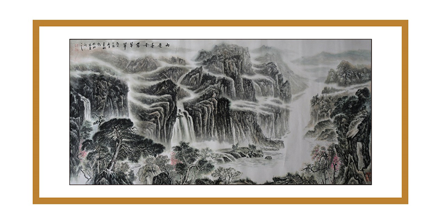 欣賞譚老的畫作,使人有一種難以言表的美感,問(wèn)及原因,他說(shuō):“為了研究山水,我閱讀了大量古、今書籍,我發(fā)現(xiàn)歷朝歷代對(duì)山水國(guó)畫都相當(dāng)重視,山水被視為鎮(zhèn)宅的代名詞,一直以來(lái)在帝王家它都是以圖騰的形式存在的。”但為了能夠更好地傳承歷史文化,他鉆研國(guó)學(xué),將儒、釋、道的精髓理念及思想融入到作品中,追求創(chuàng)造的是一種“和合”之感,讓這大氣之圖騰成為真正意義上的圖騰。